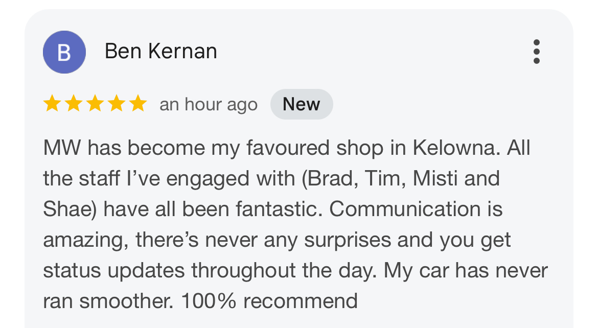 Our Kelowna customers consistently highlight three things: how clearly we communicate and explain repairs, the high quality of our work — especially for European and electric vehicles — and the professional, friendly experience from start to finish. It’s not just about fixing cars; it’s about earning trust. Give us a call today to experience the difference — and don’t forget, every repair includes a free car wash. Call now.